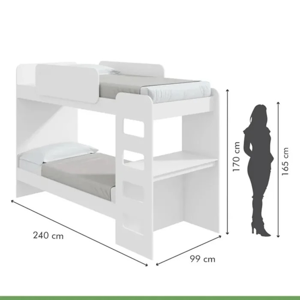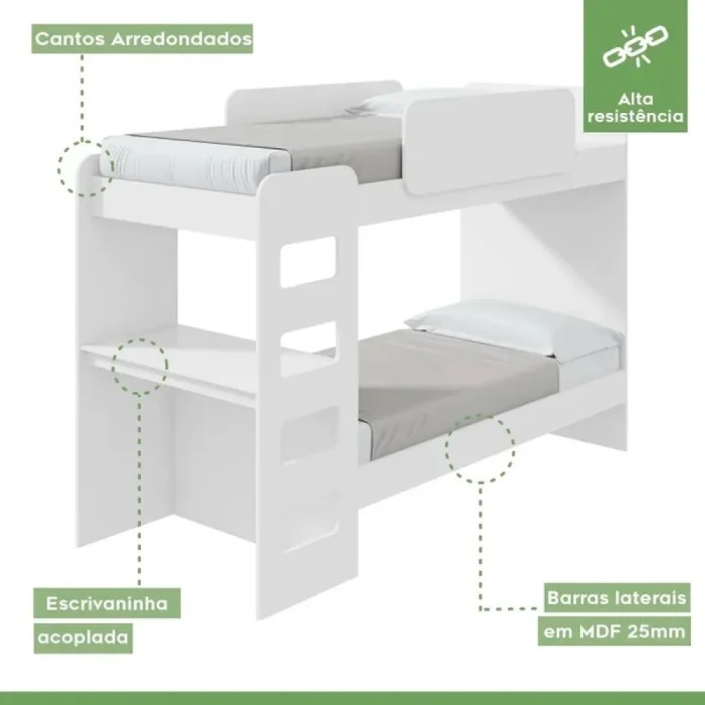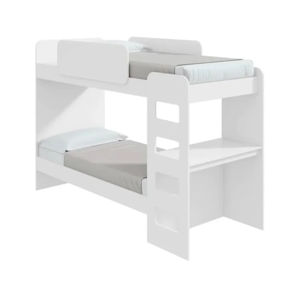 A Cama Beliche Solteiro Olga é a solução perfeita para otimizar espaços compactos sem abrir mão do conforto e da funcionalidade. Com design seguro de cantos arredondados e uma escrivaninha com LED integrado, este móvel combina estilo prático e moderno, sendo ideal para quartos cheios de personalidade.